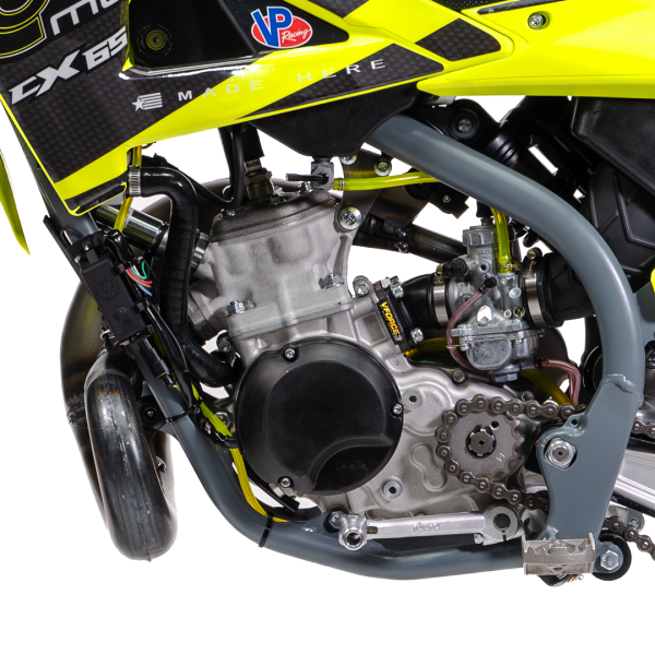 El motor CX65 incorpora un sistema de refrigeración líquida de alta eficiencia, tanto para el motor de alta cilindrada como para el cárter. Este diseño avanzado garantiza una regulación óptima de la temperatura, evitando el sobrecalentamiento durante sesiones intensas de motocross. Este innovador sistema de refrigeración contribuye a la durabilidad y longevidad del motor, lo que le proporciona una ventaja competitiva en la pista.